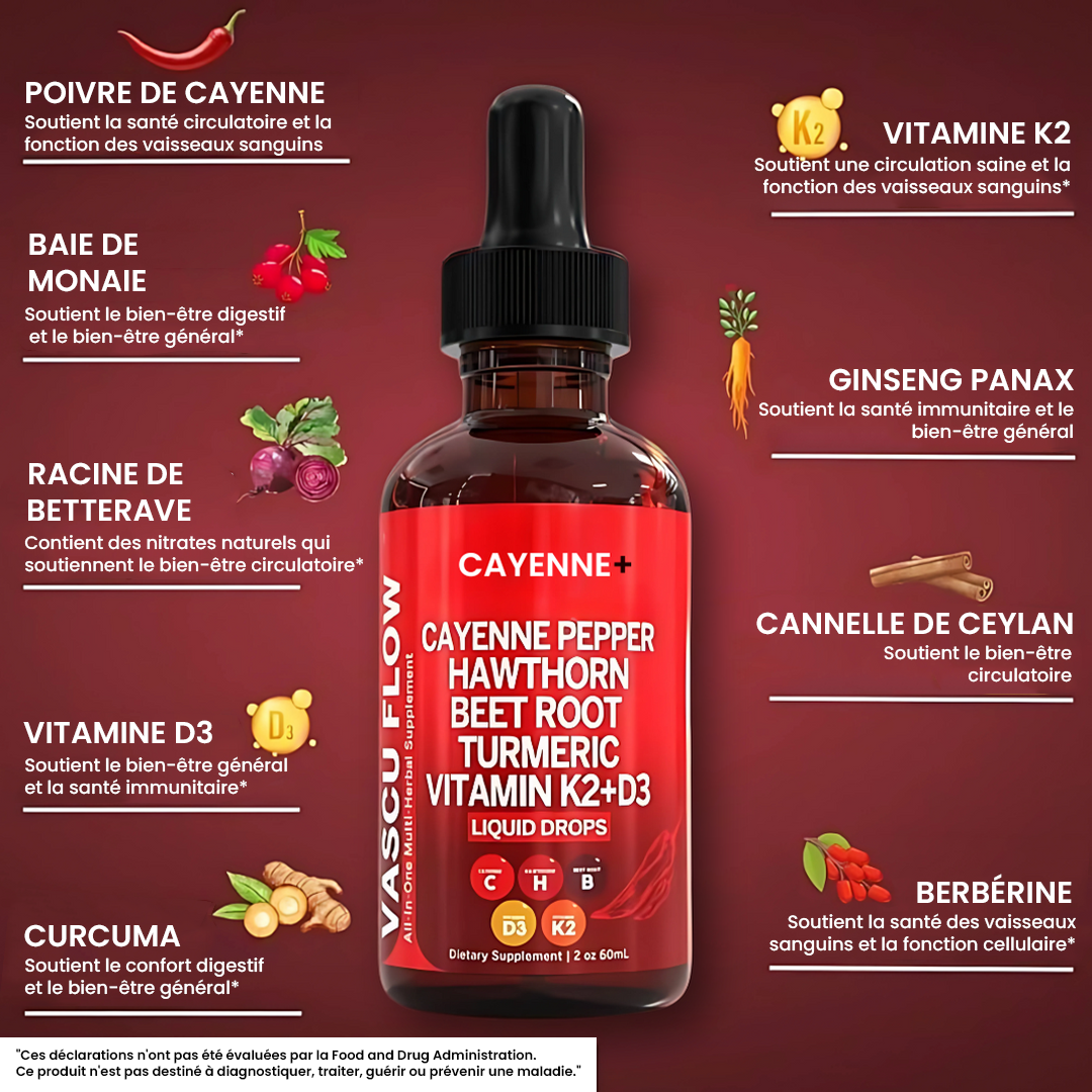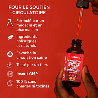 Cayenne Pepper Liquid Drops™ est une formule 100 % naturelle aide à nettoyer le sang, améliorer la circulation, réduire la pression artérielle, et revitaliser le corps en profondeur.