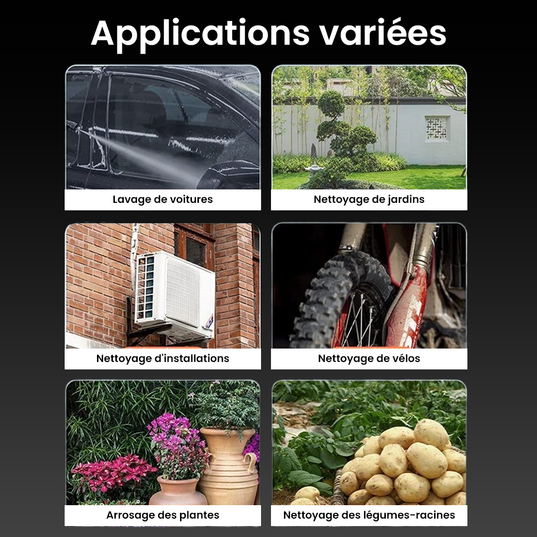 Fonctions Multiples : Ce nettoyeur de pistolet à eau est idéal pour le nettoyage et l'entretien de divers véhicules à moteur, de machines d'ingénierie, ainsi que pour le nettoyage des murs extérieurs, des sols, des piscines et bien plus encore. Il peut également être utilisé pour pulvériser des pesticides sur les cultures ou pour l'arrosage des légumes.