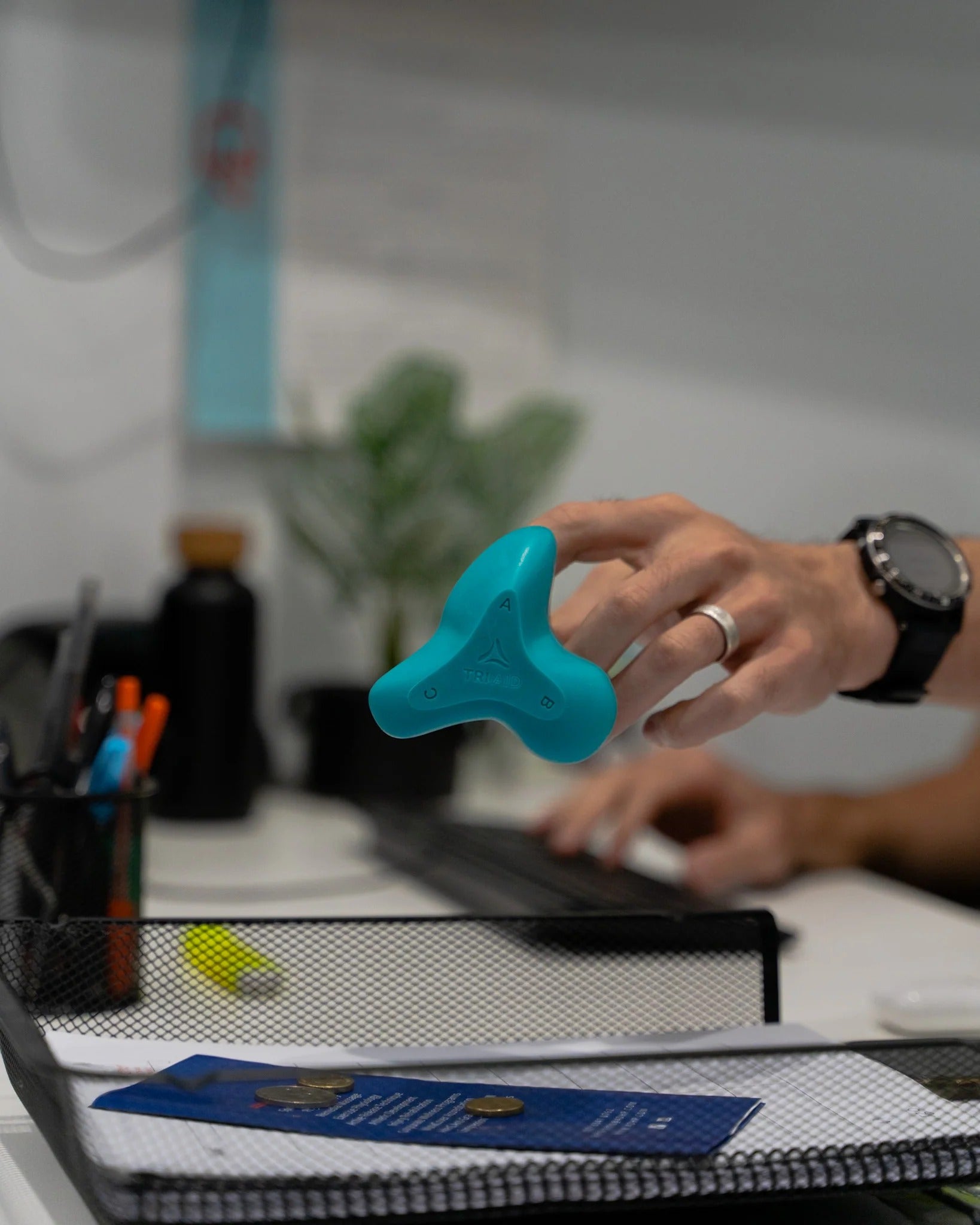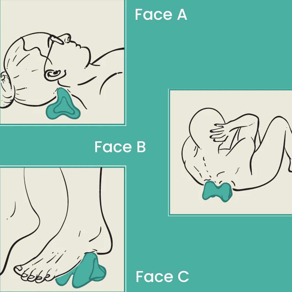Utilise simplement la pointe du Tri-Aid™ pour appliquer une pression sur la zone douloureuse. Respire, relâche, et laisse la douleur partir naturellement.